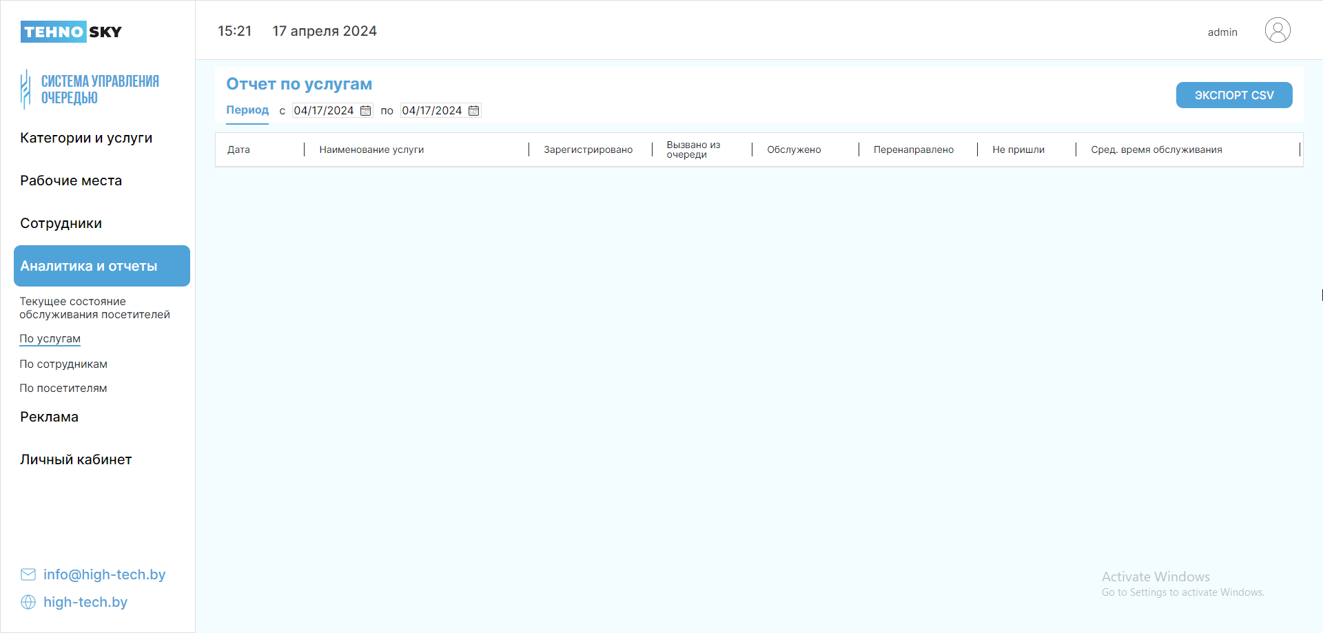 Во всех подразделах, кроме подраздела Текущее состояние обслуживания посетителей, Вы можете скачать отчет в формате CSV. Чтобы сделать это, нажмите кнопку Экспорт CSV.