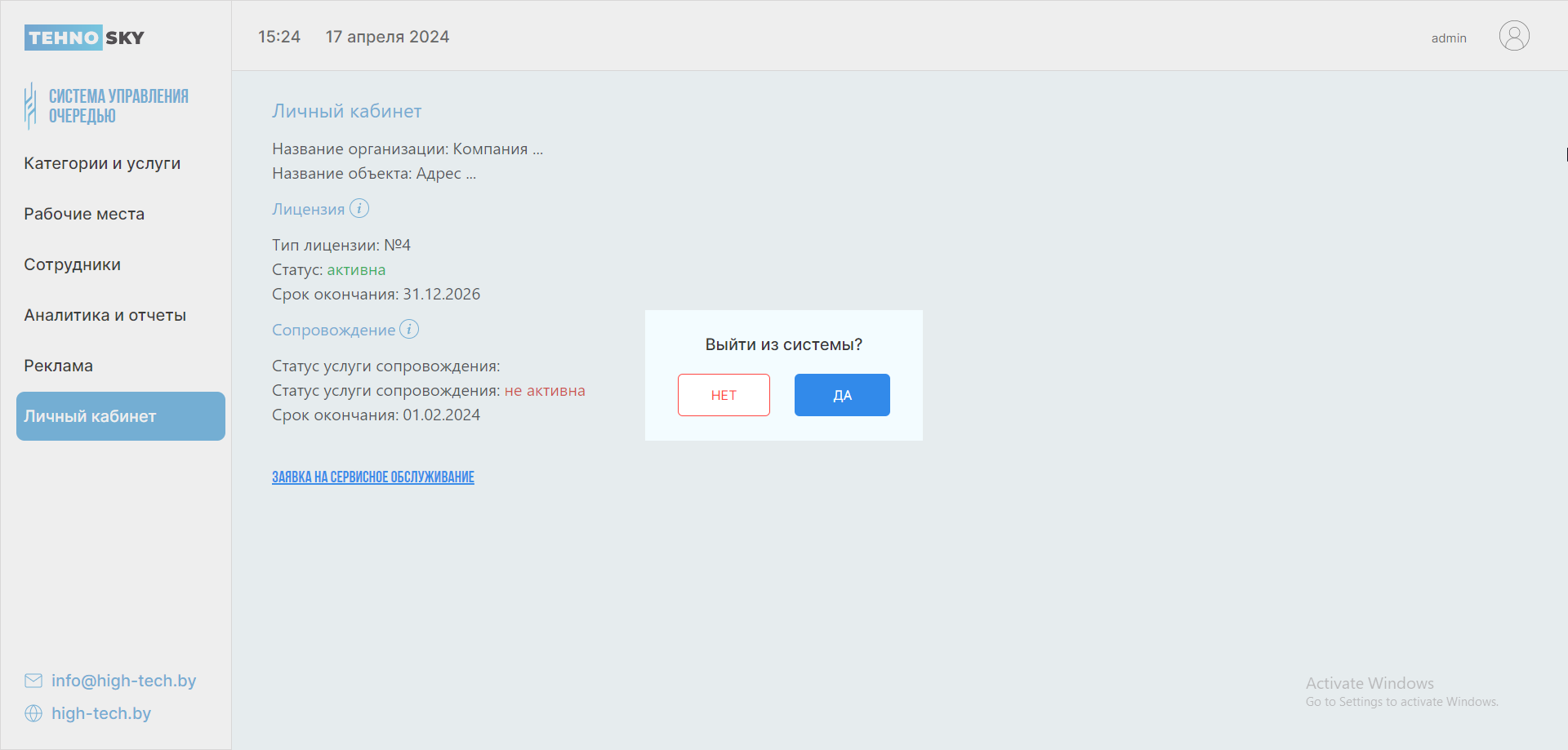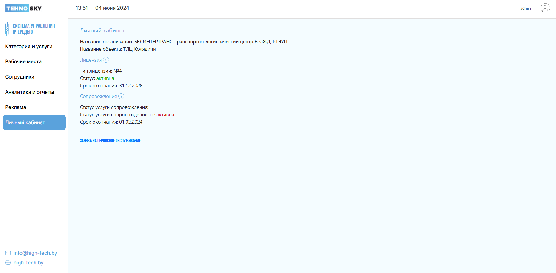 В данном разделе Вы можете ознакомиться с актуальной информацией о личном кабинете, лицензии, сопровождении, а также отправить заявку на сервисное обслуживание.
